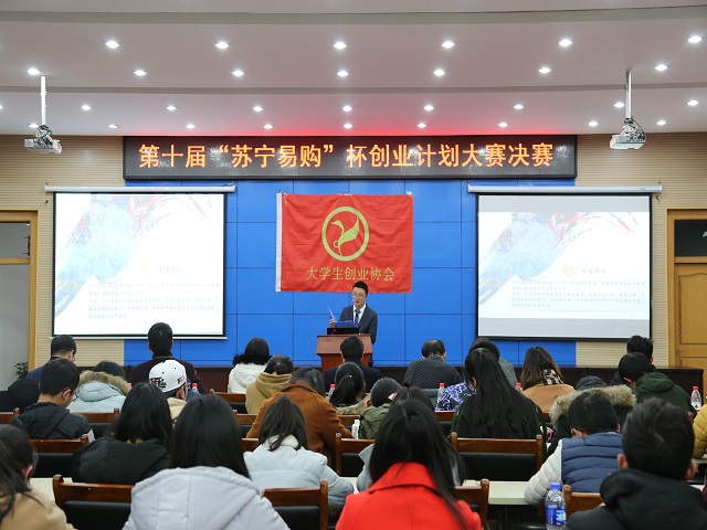 本网讯(老员工创业协会 宁一阳 张勇)2017年12月8日晚七点,老员工创业协会在美术公司二楼第三报告厅举办了第十届“苏宁易购”杯创业计划大赛决赛。本次大赛旨在为同学们提供一个展现自我的舞台,实现自己的创业梦想。出席本次创业计划大赛决赛的嘉宾有副教授胡庆十老师、副教授何建华老师、m88官网团委副书记甘伟老师、严瑞丽老师、姚韬老师、王文哲老师以及苏宁易购人力资源副总监杨晶晶先生等。