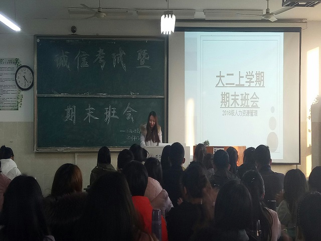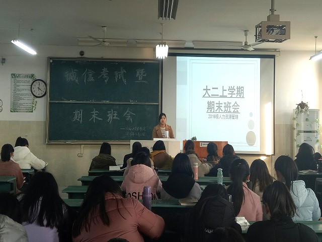 (本网讯 王玲)期末将近,为了营造良好的考试氛围,鼓励同学们在考试中取得优异成绩,并就本学期班委会成员的工作对同学们做一个总结汇报。2016级人力资源管理专业于2017年12月21日在行知楼2010603教室召开了本学期的期末考试动员大会暨期末班会。
