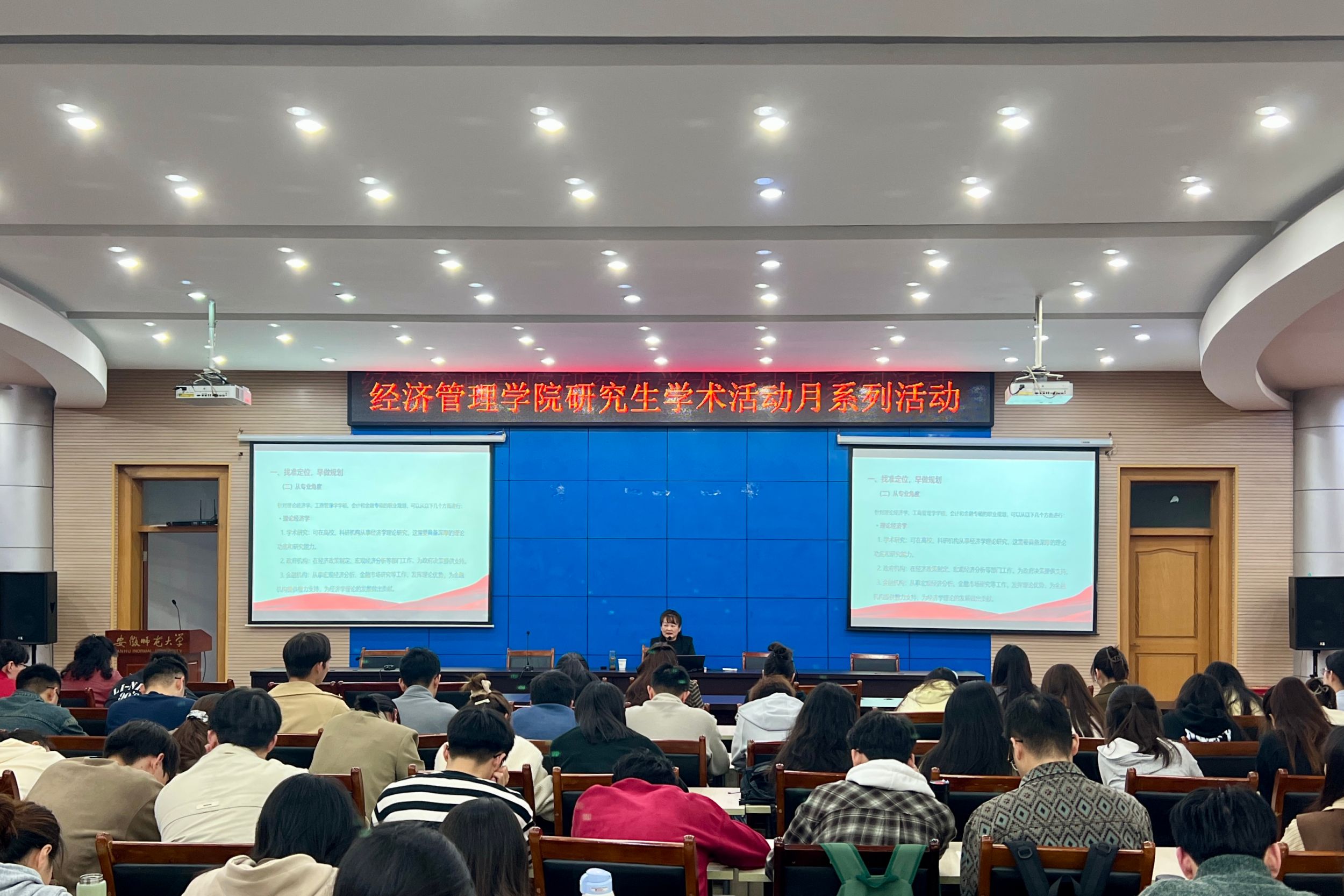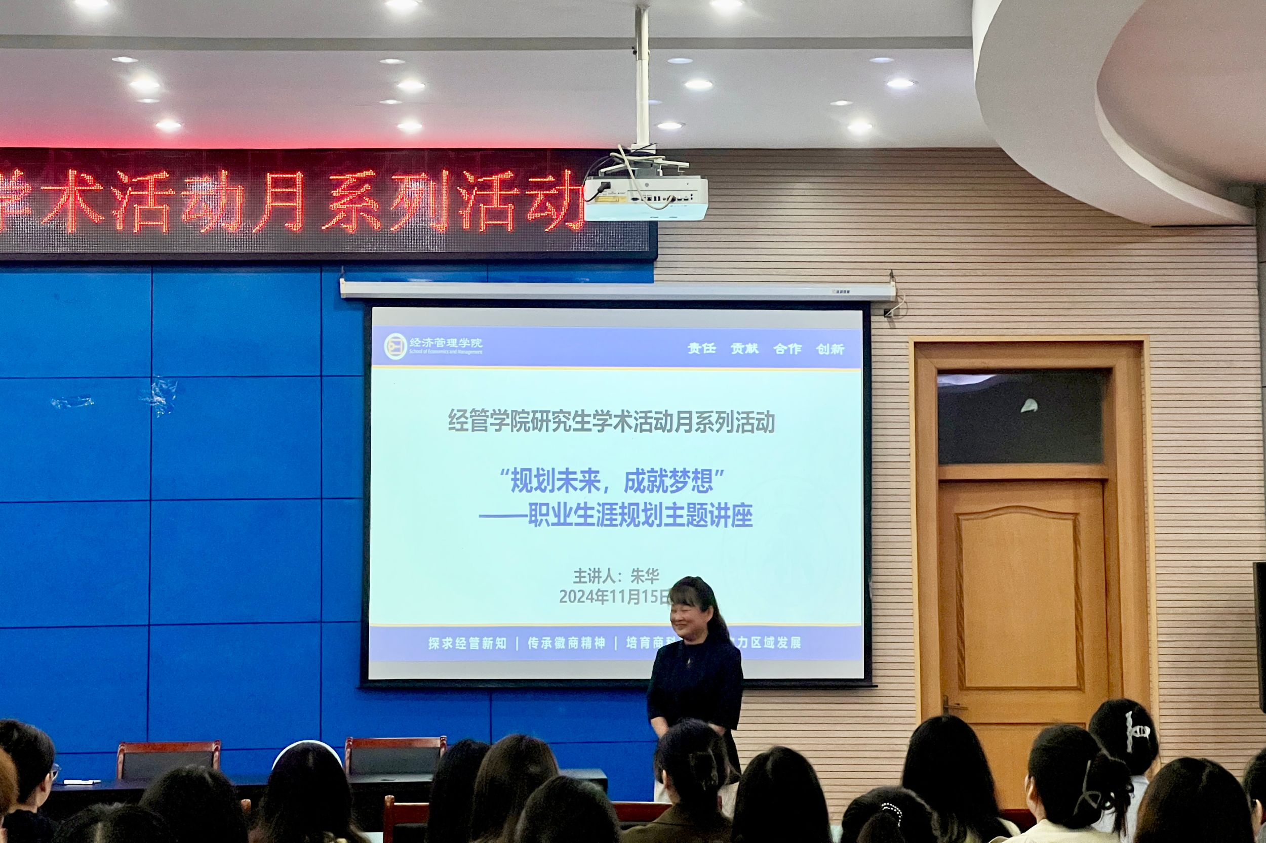 11月15日下午,m88官网在版权所有 m88官网-登录入口会议中心第三报告厅成功举办“规划未来,成就梦想”研究生职业生涯规划主题讲座,暨“研究生学术文化活动月”系列活动,特邀高级经济师、高级行政管理师朱华老师担任主讲嘉宾。讲座由研究生辅导员钟颖老师主持,2023级和2024级全体研究生近200人参加。