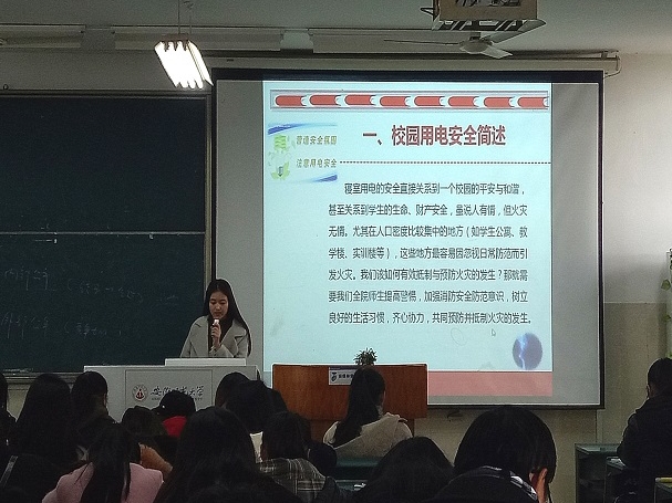 本次班会主要从校园用电描述、案例展示和安全用电注意事项三方面逐个介绍。一直以来,寝室用电的安全直接关系到一个校园的平安与和谐,甚至关系到员工的生命与财产安全。然而大多数员工却很少将此放在心上,因此大公司园,事故频发,尤其是在人口密度比较集中的地方,如教学楼、寝室常因忽视日常防范而引发火灾。根据相关资料显示,校园火灾的发生大多是电器过度使用和长时间充电、乱借乱拉电线等不规范行为所导致的。因此,在此次班会上安全委员何蒙蒙多次强调违规电器的禁用和普通电器的正确使用。除此之外,为加深同学们的印象,安全委员特找来各地高校火灾典型案例,生动地向我们展示了校园火灾的特点,让同学们充分了解到了安全意识缺乏所带来的严重后果。在班会的最后,安全委员又再次强调了安全用电注意事项和面对用电故障的相应方法。
