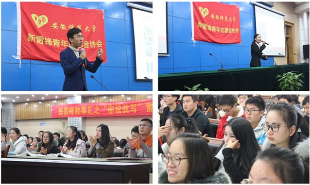 主持人宣读完比赛规则后,选手一一上台,诉说身边感人故事。2014年“芜湖好人”周耀先老先生抗洪一线、慈善助人;年迈外公的博大善良和热心助人的故事;卢丙会同志路见不平拔刀相助、义薄云天动浙皖的洒脱无畏;08年汶川地震,普通员工情系同胞,积极募捐的故事;乡村教师高志娟在三尺讲堂让自己不幸的生活重新焕发光彩;十一岁少年梁耀艺自愿病逝后多器官捐献,让生命之花在更多人身上延续;志愿服务者许江安常年献血,关爱老人的故事;还有新雷锋协会志愿者陈冰洁热心公益、为同学答疑解惑等等,每个故事都牵动着每个观众的心神,每个志愿活动更是无关年纪,生命的价值也不在于长度,而在于高度。正如雷锋日记中所说,我将用有限的生命投入到无限的为人民服务中去。