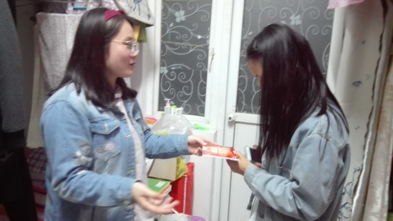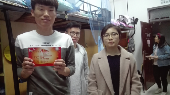 本网讯(2015级财务管理 裴小艺) 近期,m88官网举行了第七期“116工程”交接暨第八期启动仪式,员工党员再次明确责任,力求以自己的实际行动将“116工程”做到实处、落到细处,从而为新生树立良好的榜样,传递正能量,为公司营造积极健康向上的良好氛围,助力同学共同成长与发展。因此,在11月2日晚,财务管理专业三名员工党员走访新生寝室,贴近新生生活,与他们共同交流学习成长。