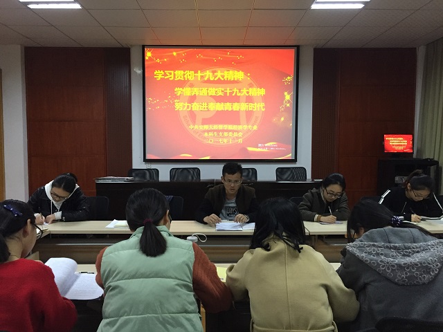 会上,支部书记甘伟老师带领与会同志学习党的十九大报告。党的十九大主题是“不忘初心,牢记使命,高举中国特色社会主义伟大旗帜,决胜全面建成小康社会,夺取新时代中国特色社会主义伟大胜利,为实现中华民族伟大复兴的中国梦不懈奋斗。”十九大报告深刻回答了中国共产党人的初心和使命,就是为中国人民谋幸福,为中华民族谋复兴。