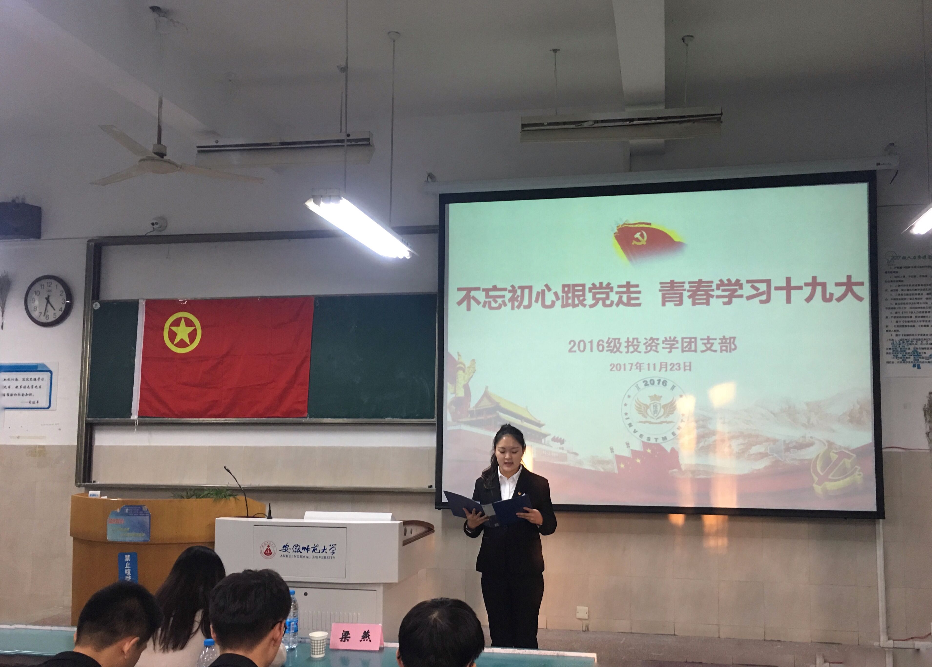本班讯(文/戴常青 图/黄安)为提升工作的运行活力,明确团支部的工作职责和工作内容,改进工作模式,促进团支部的活动开展更富针对性、实效性。为提高团员员工的活动参与度,推进“一学一做”工作,提高团员素质,促进更多团员员工积极参与团支部的工作建设。2016级投资学团支部开展了本次“不忘初心跟党走,青春学习十九大”团日主题活动。