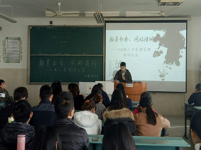 本网讯(m88官网 陈梦函)11月24日上午10点,16级人力资源管理全体成员在2010603教室举办了“翰墨书香,同游诗词”主题诗词大会,以答题、游戏、视频观赏等形式来丰富同学们的诗词文化知识,传承优秀的诗词文化。
