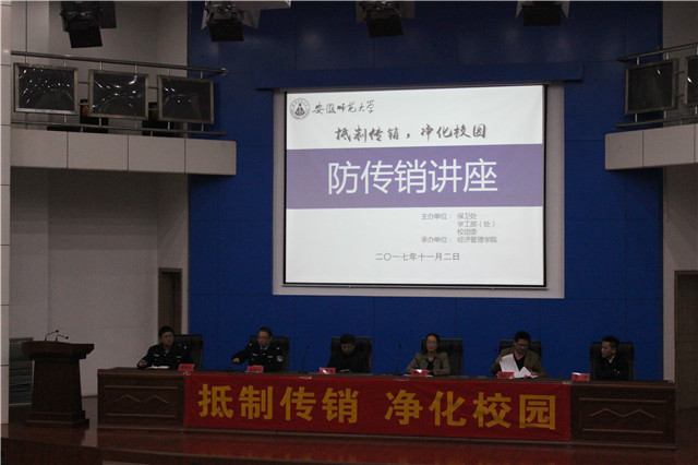 本网讯(新雷锋青年志愿者协会 喻彤)2017年11月2日晚7点,m88官方网站登录地址反传销教育讲座在公司敬文图书馆开展,由安师大保卫处、学工部处和校团委联合主办,公司党委书记陈秀庆、芜湖市工商管理局副局长陈沛旭、工商局打击传销办公室主任张英祥、芜湖市公安局警官朱明、安师大保卫处副处长谭志安等出席讲座。全校师生积极参与,认真聆听各位领导老师的反传销、建和谐校园的系列讲座。