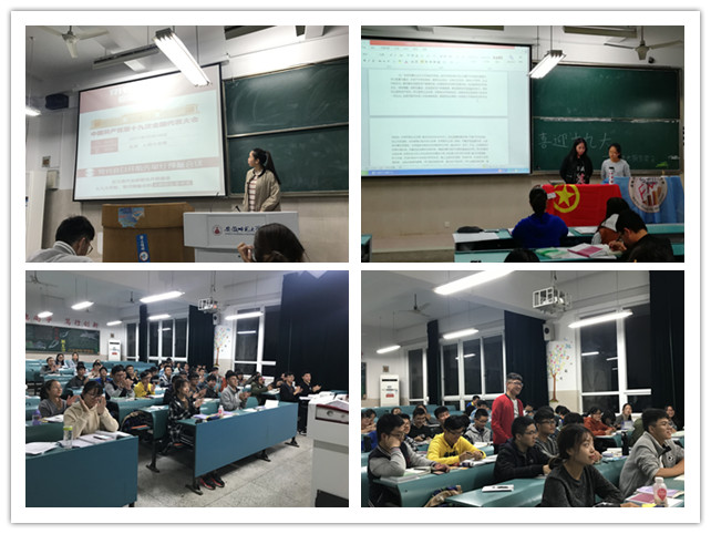 会上,团支书首先就十九大召开的时间、背景进行了简要的介绍,又以流程图的形式展示了党的代表大会中几次会议的具体内容,让同学们对党的代表大会有了直观的了解;然后,围绕十九大的主题深入浅出的解读了在中国社会发展新常态的背景下,中国在过去五年所取得的十大成就,和在未来五年中国在现代化建设过程中所要做到的“三个必须”、“五个伟大”、“五个更加自觉”和“八个明确”,加深了同学们对未来中国特色社会主义道路的认识,让大家深刻感受到中国共产党前所未有的从容与自信;最后,结合专业和当代老员工的实际,着重介绍了现代化经济体系的建设在未来的发展方向,鼓励同学们要加强个人素质与能力的培养,努力学习专业知识,迎合时代的潮流投身于下一阶段中国特色社会主义事业的建设之中。