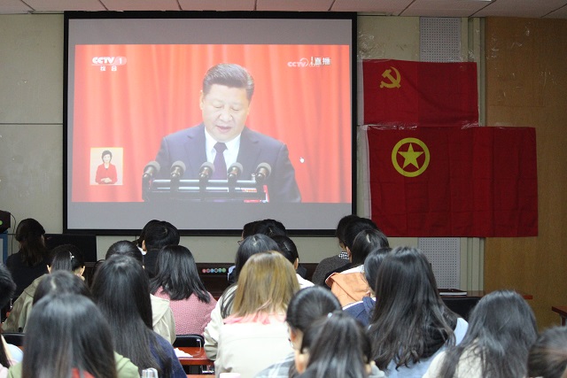 宣传工作以各年级党支部为抓手,指导所属党支部组织全体党员以“三会一课”等形式,进行深入学习讨论,同时党课班开展集中观看十九大开幕式,举办十九大宣讲班会、学习交流会等特色活动,来深化员工党员对十九大精神的理解体会,着重把握五点要求,深刻学习领会中国特色社会主义进入新时代的新论断;深刻学习领会我国社会主要矛盾发生变化的新特点;深刻学习领会分两步走全面建设社会主义现代化国家的新目标;深刻学习领会党的建设的新要求;深刻学习领会报告提出的教育发展新蓝图,增强“四个意识”,坚定“四个自信”,并把学习贯彻党的十九大精神作为今后培训的主要内容,把学习贯彻党的十九大精神同学习马克思主义基本原理贯通起来,把学习贯彻党的十九大精神同把握党实现伟大梦想的实践贯通起来,把切实将学习贯彻十九大精神与教学和日常管理贯通起来。不断探索“互联网+学习”新模式,通过专题学习网站、微信群等网络平台开展学习,交流心得体会,提升学习效果;发挥群团组织作用,开展各具特色的学习宣传贯彻活动,举办征文演讲、主题班会、知识竞赛、黑板报橱窗展等文化活动,以喜闻乐见的方式在师生中广泛宣传习近平新时代中国特色社会主义思想和党的十九大精神。