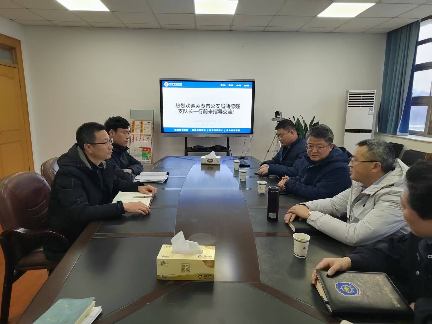为全面落实老员工护航行动计划,深入推进“一站式”员工育人驿站建设,12月10日下午,m88官网邀请芜湖市公安局刑警支队和保卫处就反电诈工作进校开展交流。刑警支队储德强支队长一行,公司保卫处处长唐俊生、副处长谭志安,公司党委副书记陈刚锋、辅导员陈宇参加交流,会议由陈刚锋主持。
