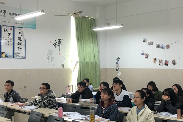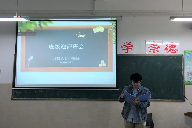 本网讯(16中美会计李文卓 凌潇潇)为了营造良好的迎评工作氛围,迎接本科生基础文明与学风专项检查,今天上午在本专业固定教室,班长李文卓、学习委员李嘉桐、生活委员唐群以及安全委员潘黄安为大家召开了班级迎接本科教学评估的班会。