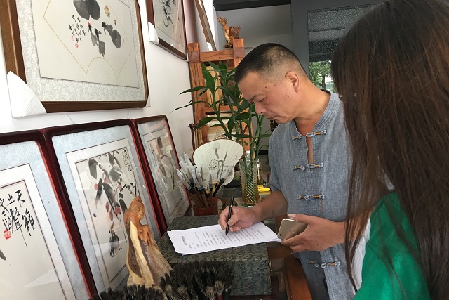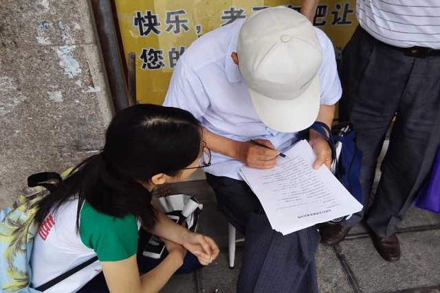 13位团队成员于6月30日上午八点,人手拿着调查问卷后开始分头行动。大家分别前往街道、公园、社区,有目的地寻找路人填写调查问卷并礼貌介绍、说明问卷的意义。即使有时会被拒绝,但是团队成员们依然在烈日下坚持了下来。其中有一位退休人民教师对于我们的调查很感兴趣,他觉得想要弘扬宣纸文化,首先要提高全民族的人文素养,从娃娃抓起,培养孩子高雅的爱。他说,近年来县政府举办过的小员工规范汉字书写大赛,为彰显泾县艺术教育特色,传承宣纸文化做出了积极的贡献。