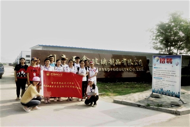 由于工业园区距离城中心较远,团队成员们6:45前往公交站台等待,在经过40分钟的车程后又坐了当地三轮车到达了此次活动的目的地。初到工厂,一位工厂负责的女士接待了大家,并告诉大家可以观看调查拍照的地域,随后团队分成几个小组进行各自的实践。在这次调研中,大家对玻璃的制造产生了极大的兴趣,每个成员都很认真的观察并询问工作人员关于玻璃制造的相关信息问题,了解了玻璃生产,销售的流程进展。