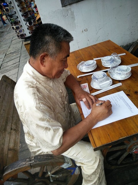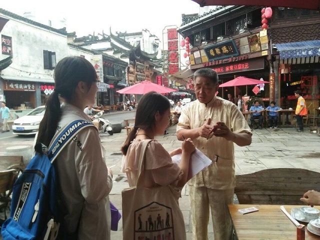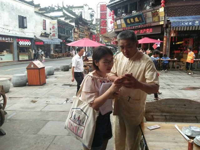 有时惊喜就是不经意间上帝为我们准备的礼物,团队与黄山市创建全国文明城市形象大使金叔叔相遇。他身着黄色唐装,举手投足之间都带着文韵还有特别的气质。经过一番交流,他为团队的调研工作提出了指导意见,同时也尽情的向团队展示黄山文化的魅力。作为一个城市的形象大使,他不仅代表了黄山的文明形象,也代表了徽州文化的具体印象。通过思想的碰撞,大家冲破了浮在表面的文化介质,转而向里渗透了徽州文化的精髓。