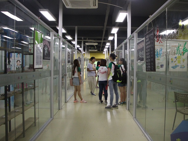 在刘羽佳的带领下,合肥一队参观了创客空间A区。这里的办公间由玻璃墙隔出,实训区的办公间是每个公司拥有一间,经过选拔的优胜的项目即可获得入驻权。孵化区是由向公司申报通过的四个团队共用一个较大的办公间,拥有各自的办公桌展示各自产品。调研得知,创客空间为团队提供免费场地,免费水电,创客学子们只需带着自己的点子和产品来,就可以像企业一样经营运作。不仅如此,公司还为A区的团队提供了许多比赛机会和资源分享,创客团队通过公司报名各种创新比赛,如“挑战杯”等,就可以因此接触许多知名企业,获得投资或合作机会。