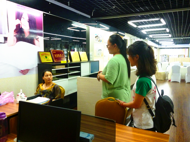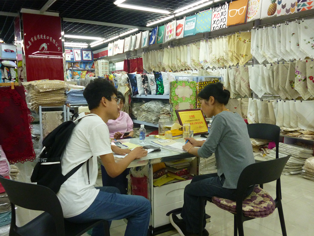 通过6月27日对青岩刘村的走访调查,队员基本了解了该淘宝村的发展历程及现状,为更深层次的了解淘宝村的供货系统,队伍选择了义乌市国际商贸城作为调研地点。在初步了解了商贸城营业布局后,十一名队员分为三组,分别对其两个分区的不同楼层的店主进行访谈,采访对象包括主营家居用品、服装内衣和皮具等商品的零售以及批发业务的店主等。通过访谈,队员们了解到该商贸城内主要以线上和线下两种方式销售产品,基本上以实体店为主,网络销售为辅。针对网店较少这一典型现状,队员们通过采访了解到其主要原因包括该商贸城经营者的年龄偏大且对网络认识有限,而且一些商品的定做数量有一定的起点,并不是适合网络上的现货零售模式,而从事网店销售的多为微商起家的年轻人,尽量满足客户“物美价廉”的需求。该商城的网店多通过义乌购这一平台进行大批量销售,此平台在商厦内设立办公点组织管理网上销售活动,接受国内国际订单,确保贸易顺利进行。