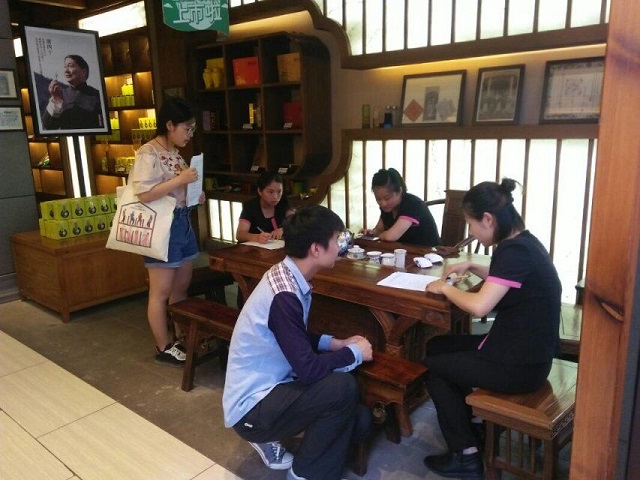 6月27日上午8:30,大家三两分组拿着之前准备好的调研报告向屯溪老街进发。一路上只有古色古香的二层徽派建筑,阴雨未歇,丝丝雨点沿着灰朴的屋檐向下敲击着青石板路,这丝丝的水汽却与两边热情淳朴的店客的吆喝声完美融合,一点不让人觉得违和。沿路将调研表分发给店主、路人,他们大都乐意配合,这其中有在门口叫卖的烧饼店主,有闲待在路边桌椅上的游客,也有偶然路过的行人,不论如何,阴雨并不能阻隔人们相遇交集的节点,正是有了他们,团队或娴熟或生涩的调研问卷的发放才能如此圆满。短短一上午的时间,便有了很大的收获,不只是在物质上获得了调研成果,同时也锻炼了队员的社会实践能力。