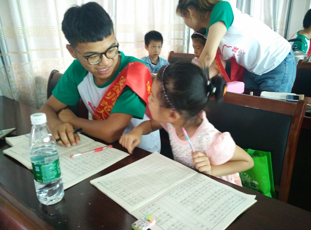 今天,小朋友们都带来了自己的暑假作业,志愿者们先带小孩子们做功课。小朋友们都事先安排好了自己的任务,上午写两张作业,下午写两张作业。虽然孩子们玩起来很嗨,很闹腾,但是做起作业可是十分认真的。每当遇到不会的题,便来咨询志愿者,“老师,老师,你看这题怎么做呀?”小朋友们仰起稚嫩的脸庞,用天真的眼神看着志愿者,寻求帮助。我们的志愿者们也很耐心地帮助小朋友们解答问题,“你看,这题我们先看下题目要求,然后···”,辅导期间,志愿者与小朋友相处的非常愉快,近两个小时的学习在欢声笑语里度过。我们的辅导重在教会小朋友如何学习,而不是做对一道题,学会一个词语,一个公式。志愿者们教小朋友如何去思考,学着动脑,开发出自己无限的潜能。