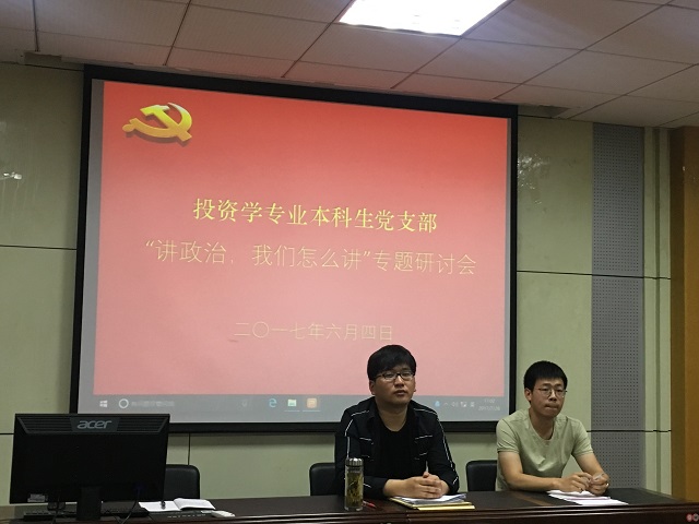 在组织大会结束后,投资学专业本科生党支开展了“讲政治,我们怎么讲”专题讨论会。吕洋带领支部成员认真学习了公司《关于在推进“两学一做”学习教育常态化制度化中开展“讲政治、重规矩、作表率”专题教育的方案》的文件精神。开展“讲政治、重规矩、作表率”专题教育是“两学一做”学习教育的重要内容,是加强常态化制度化建设的重要载体。吕洋强调全体党员要提高意识,坚持不懈强化理论学习,强化先锋模范意识,坚持对照“四讲四有”标准,进行自我查改,营造良好的学习氛围,进一步增强政治意识、大局意识、核心意识、看齐意识,切实做到政治合格、执行纪律合格、品德合格、发挥作用合格,以实际行动作表率。