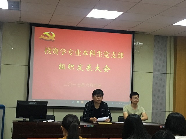 本网讯(投资学专业本科生党支部 陆帆)6月4日18:00,m88官网投资学专业本科生党支部在公司行政楼二楼报告厅召开了组织发展大会,支部全体党员及拟发展对象参与了此次大会。大会由支部书记吕洋主持,主要讨论陈奇、唐婷、李昕雅、钟杰4名同志发展问题。