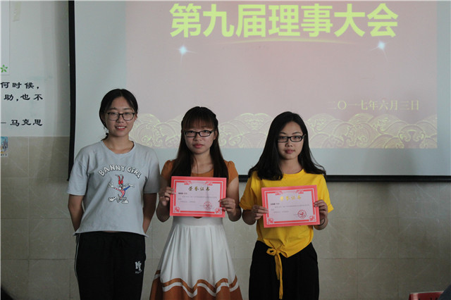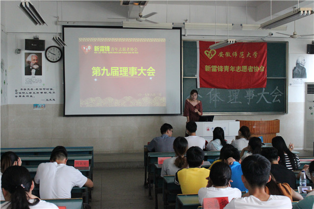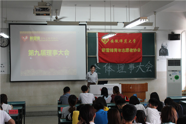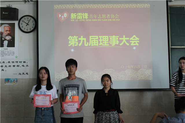 我们的第九届理事大会也是一个总结大会。首先由会长姚万焕学姐为我们做工作总结,学姐先是总结了这一年我们所做的活动,而后也为我们学弟学妹们讲述了一些她的感想。会议第二项是各部门部长为部门优秀理事颁发奖状,每个部门两位优秀理事,接下来就是优秀理事代表讲话,大家也都讲述了自己在这个大家庭中的经历,收获和成长。会议第三项是各部门部长讲话。学长学姐们也都讲述了自己这两年来在协会的收获,并且也对我们理事们提出了一些建议,希望协会会越来越好,有所创新。接下来是会长团的学长学姐们上台讲话,他们用自己在新雷锋的的经历来告诉我们什么是成长。随着时间的流逝大家也都有点饿了。学长学姐们为我们准备了零食,大家一边吃着零食一边观看协会用这一年协会的活动来制作的小视频。所有人都开心的笑了,原来这一年我们做了这么多事,付出了这么多,但我们也收获了很多,关于欢声笑语,关于友情,关于成长。为了增进大家的感情,协会还准备了两个小游戏,大家都玩的很开心。最后,大家一起到图书馆东门进行合影留念,然后是各个部门合影。