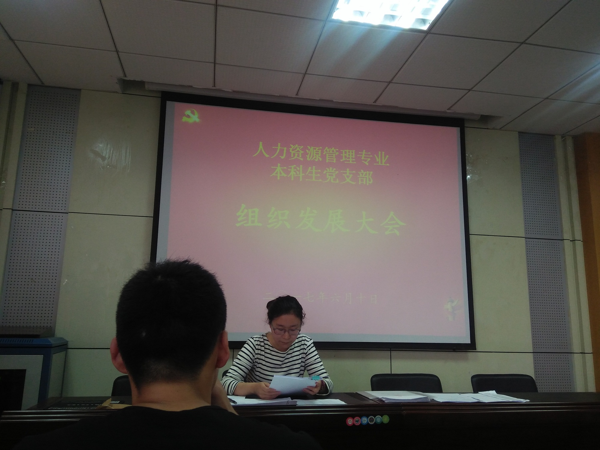 本网讯(m88官网 莫燏)m88官网人力资源管理专业本科生党支部于6月10日下午14:30,在m88官网行政楼二楼报告厅召开讨论接收预备党员的支部大会。支部有11名正式党员、13名预备党员以及本次拟发展为预备党员的8名发展对象参加本次会议。本次组织发展大会由党支部书记吴敬之老师主持会议。