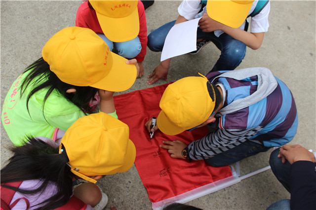 在活动开始之前,每一个小朋友和志愿者们都在签到表上进行签到。小朋友们来齐之后,进行游戏分组,分别为黄队,红队,蓝队。每一小队根据自己的队旗想出队名和队的口号,还可以在队旗上面画一些标志性的图画来体现自己的团队精神。黄队的队名为小黄人队,他们要找的地点是老海关。红队取名为坚持不懈队,他们要找的地点是中江塔。蓝队取名为勇往直前队,他们的地点是芜湖造船厂!大家都对比赛充满了期待和信心。