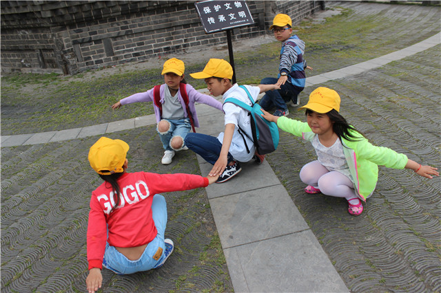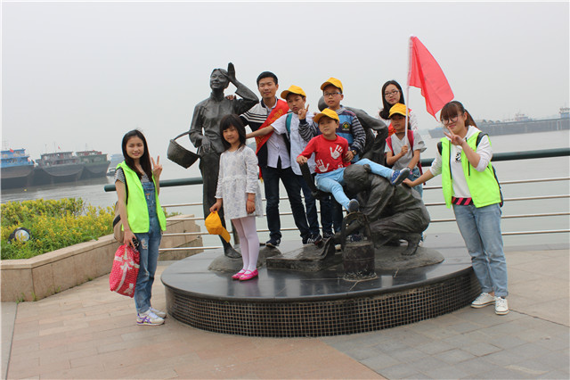 找这些地方并难不倒我们的小朋友们。他们在队长的带领下,在路人的帮助下成功的找到了目的地。刚到目的地的时候小朋友们都很兴奋,对美丽的中江塔,风韵的老海关,历史悠久的芜湖造船厂很是痴迷。在我们的提醒下才想起自己是带着任务来的。所以小队长带着队员们开始完成自己的任务。第一个便是摆造型。小黄人队需要摆成H形,然而只有五个人,要如何摆成标志的H形呢,这时我们小黄人队的小队长想到了一个方法,他让四个人张开双手,面对面分两组,自己则蹲在中间,一个标准的H形出现了。不得不说我们的小朋友们真的很棒。坚持不懈队和勇往直前队也都通过自己的智慧完成了第一个任务。大家很开心的进行拍照留恋。