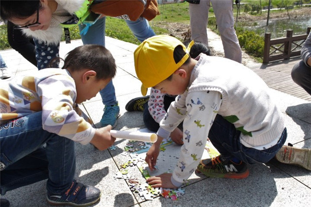比赛的三组成员由萝卜蹲游戏来决定出发顺序。第一站活动在安机电开始,智力问答环节,孩子们在家长的协助下回答完三个问题即为通过。孩子们完成了第一站活动后快速的来到下一站。第二站是在皖医进行的乒乓球进篮,由小孩投球,家长接球,5次一轮,接住三次即为通过。第三站是在商贸公司开展的筷子夹弹珠游戏,小组的成员在一分钟内将盘子里的弹珠夹到另一个盘子内即为通过。第三站结束后小朋友们又马不停蹄的来到芜湖职业技术公司开始第四站旅程。这也是考验小朋友们动手动脑能力的时候,他们需要合作完成一个拼图。游戏结束后就可以向终点站——安师大情人坡进发啦。在这里,我们的志愿者藏起了九个物品,等待着他们来寻找。很快,黄队先下手为强,最先找到,与此同时,我们也为他们准备了一些题目,小朋友们通过询问身边的同学顺利的完成了任务。