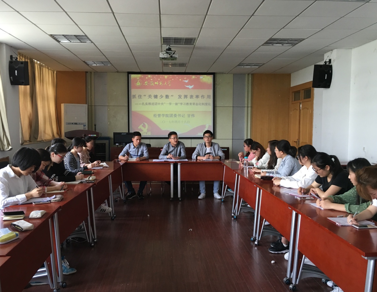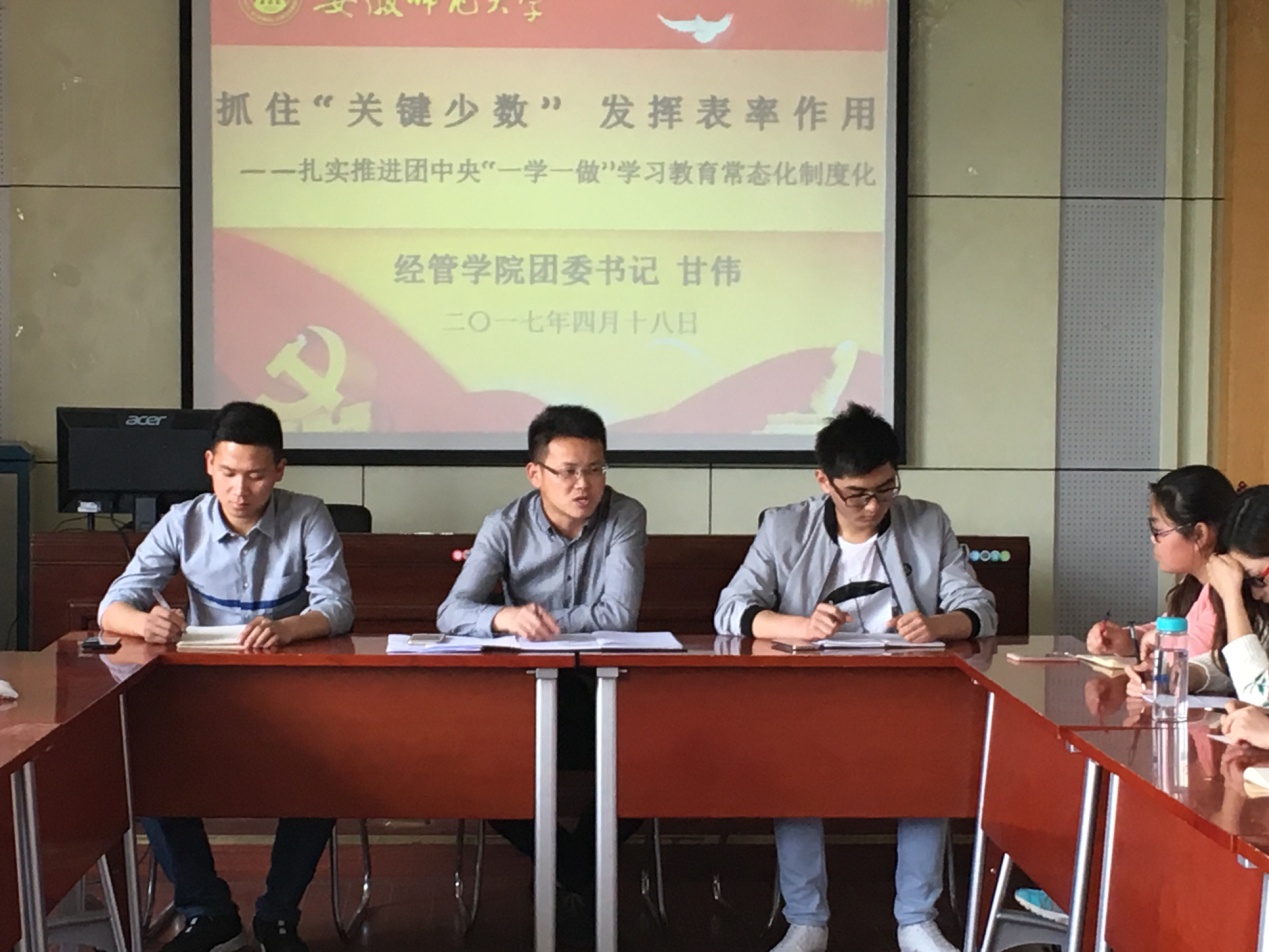 会议第二项,甘伟老师结合党中央“两学一做”精神要旨,进一步落实团中央“一学一做”,提出新时期团学青年分层指导新思想,强调在新的形势下,支部工作开展应“有理有据,有的放矢”,力排“孤芳自赏”现象,抓住“关键少数”,确保“关键少数”的代表性、先锋性、示范性,并确保“一学一做”工作的常态化。