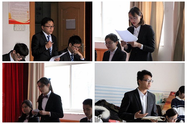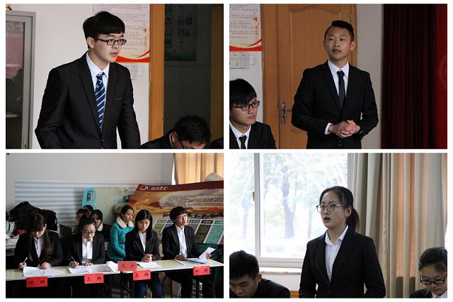 大主题下有五个小的主辩题,分别是高校扩招是否有利、成功的文学作品能否被翻拍为影视作品、中国社会是否接纳“高调行善”、就业压力是否利于老员工成才、老员工是否做兼职等。工作人员将党员电化教育中心分为一会场,会议室为二会场。前三个小辩题由一会场辩手辩论,后两个由二会场辩手辩论。选手共有正反方两方,双方各有四个辩手,一辩由队长担任,双方按照规则顺序,即由队长进行2分30秒的立论,双方围绕立论进行两轮1分30秒的攻辩,1分30秒的攻辩小结,4分钟的自由辩论,由四辩进行3分钟的总结陈词、回答观众2个之内的提问、评委总结及打分、公布成绩等八个环节。辩论时选手们不失风度、面带微笑,他们良好的风范、出色的口才、敏捷的思维令场下观众为之折服,掌声不断。赛场气氛紧张热烈,双方辩手你来我往、侃侃而谈。现场的评委和工作人员也是极其认真与负责,评委合理的提出自己的意见与看法,工作人员在一旁负责维护秩序与举牌提醒时间。最终结果是15会计中美,15投资,15财管,16经济,16会计五支队伍进入了辩论赛复赛。