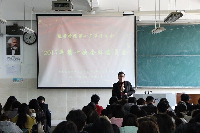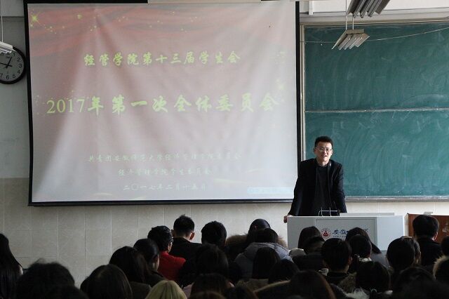 会议伊始,何成在祝贺院全体员工会成员新年快乐之后,对上学期各部门的工作进行了一下简单的总结。然后按照会议安排,本次会议照常分为两个部分,第一部分为团委副书记甘伟及主席团成员发言。在会议的第一部分中,首先由员工会的几位主席向在座的员工会成员们致辞,他们表示:新的一年开始了,员工会的成员们应当做全新的自己,应该在下半学期当中撸起袖子加油干,在新的一年里大家携手共进,一起努力工作。他们也特意强调:在下半学期里,部长们会适当的进行权利下放,让委员们担起责任,大一委员们更是要积极转变态度为自己的部门做贡献。此外,在座的员工们在工作之余不要忘记学习,学习之余不要忘记开拓眼界,不要仅仅局限于书本知识,要把自己的视野放在更宽广的地方去。在团委副书记甘伟的发言中,他强调,新学期的部门建设不能落后,各个部门都有争当优秀部门的机会,委员更要积极踊跃的表现自己。对于学习方面,甘伟引用了古语”大学之道,在明明德,在亲民,在止于至善。”来解释其对学习的看法,他还指出“大学之大,在于有容乃大”,意寓我们要学会包容与理解,多用宽容之心善待身边的每一个人,且他还寄语在座的员工会成员们要多思考上大学的真谛,努力学习,踏实奋进。会议的第二部分主要为委员们自行发言,委员们也表现得十分积极向上,纷纷谈到了自己在员工会工作了半年的感受和收获,并说出了自己在新的一年里的愿景与追求。