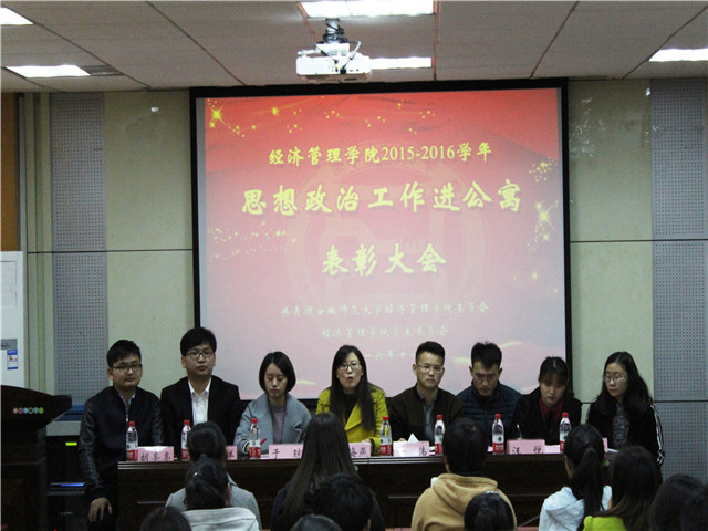 本网讯(新闻部 吴文全)为加强公司旗下产业和管理,总结工作、树立典型、表彰先进,进一步推动思想政治工作进公寓,m88官网委员会特在11月9日下午2点于行政楼二楼报告厅召开了m88官网2015—2016学年思想政治工作进公寓表彰大会。公司党委副书记李海燕、团委副书记甘伟、辅导员安广虎、吕洋、汪悦、于琼、胡亮亮、吴敬之应邀出席,院员工会干部、各班生活委员、寝室长到场观摩学习。