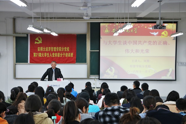 “中国共产党为什么正确、为什么光荣伟大、为什么值得追求?因为首先中国共产党具有先进性,是先进的代表。”刘勇首先为我们打开中国共产党先进的大门。无论是老员工党员,还是工人党员、教师党员、解放军党员,他们都是先进性的代表。刘勇回溯历史,并表示,中国共产党的伟大在于它由小到大,由弱到强,由不合法到三个代表,由领导政权到长期领导政权,在于它的中国特色社会主义道路要在两个百年内实现中华民族的伟大复兴;中国共产党的光荣在于它的拼搏奋斗,在于无数革命人士在民族的危急关头为了国家大义牺牲了小我;中国共产党的正确在于能够做出正确的选择并能够自我完善、与时俱进、自我净化、永葆青春。刘勇老师一直关心关注员工工作,注重于与员工交流,他希望在座的各位入党积极分子都能学先进、赶先进、做先进,只有自己提高了,才能成为一名光荣的共产党员。