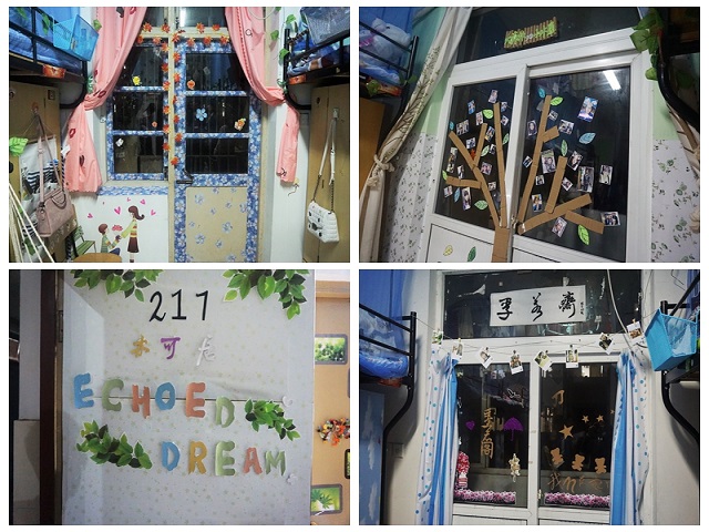 评委们首先按照入选决赛寝室的名单表依次进行评分。进入寝室后,评委们要求各个寝室介绍本寝室设计构思、装饰的制作以及前期购买的不足和后期的完善过程,并对各寝室进行点评,指出其设计的出彩之处与存在不足的地方。相比于初赛时的寝室设计与解说,各寝室在决赛时已经有了更大的改进。各寝室根据评分细则的要求,在透析“书香寝室”设计大赛举办的目的以及大赛对寝室的整体布局、手工制作装饰的欣赏等方面多下了功夫。从别具一格的寝室名称、别出心裁的寝室风格、或大气或清奇的整体布局到精致唯美的家庭相册,生机勃勃的盆栽植物,简单实用的遮光窗帘等为寝室的装扮增添了亮色。大多数寝室主要以温馨舒适、绿色环保、干净整洁为主题,其废物利用手工制品相比初赛有所增加。各寝室解说员的解说也很到位,且能够充分体现出各寝室在装饰过程中的团结协作的精神。各评委在认真评比之后,依照公平公正的原则对各个寝室进行了打分。