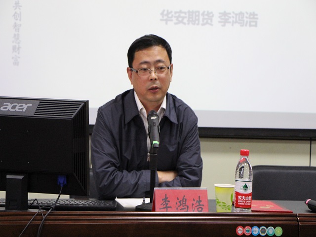 此次讲座共分为两个部分,第一部分为期货市场发展状况。李鸿浩教授指出,在如今的经济市场中,金融产业支出越来越突出,在金融产业中期货产业毫无疑问的占据了一部分市场,对此,了解期货市场运行与制作是一名投资人所必备的技能。在这部分讲座中,李鸿浩教授向同学们解释了期货到底是一个什么样的行业,期货的功能是什么以及期货市场的发展历史,并详细的分析了国际期货市场交易品种的发展和国内期货市场目前的发展状况。李鸿浩教授还表示在众多市场中,期货市场以其信息披露透明化、交易机制灵活化的特点成为目前中国监管最严历的金融市场之一。