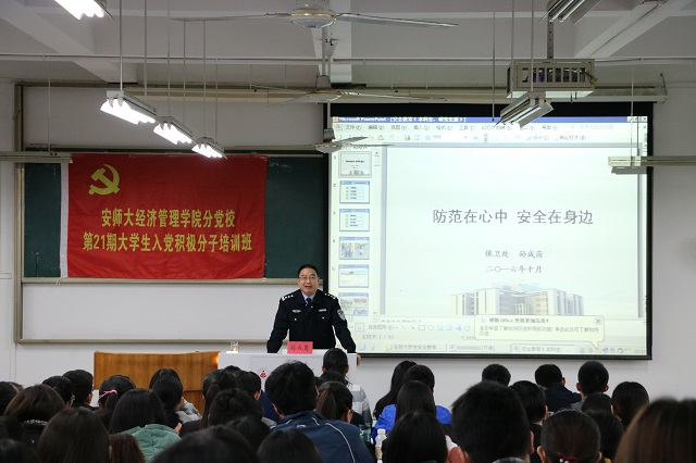 讲座主要围绕“高校校园安全类型、案发特点、应对措施、诈骗犯罪的常见骗术”等四大主题进行。作为公司保卫处处长,校园安全保障第一人,孙成岗向各位学员介绍了近期的校园安全形势。无论是省外各大高校、名校,还是我们本地周边大学城,目前校园安全形势依旧十分严峻,盗窃、诈骗案件频发,同学们一定要提高警惕,加强防范。紧接着,他结合各大高校真实案例和视频介绍,对校园暴力、交通安全、财产安全、食品安全、消防安全等七个校园安全类型作了重点讲解和深入分析。结合大量统计数据,从案件类型、作案地点到作案对象,他带我们层层分析。说明了高校安全案件发生的特点,解释了诈骗犯常见的几种骗术,并详细地向同学们阐述了应对措施和防范方法。与此同时,对于培训班学员,他更是充分信任,并提出殷切希望。作为入党积极分子,我们在自我学习的基础上,应做好表率作用,要把这些安全知识传递给身边的同学,将安全教育播撒在我们师大的每一位学子心中。