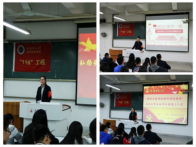 2014级财务管理班长吴海峰从自己学习“两学一做”谈起,只有时刻学习党规党章、学习系列讲话,才能做一名合格的共产党员;预备党员张欢欢是班级里的学霸,她则通过带我们学习红军长征胜利80周年讲话,回忆以前的峥嵘岁月,希望我们能努力学好知识,用才能为家国做贡献;员工会副主席陈思琪同样也是班级的学习委员,如何把握员工工作与专业学习的关系,她与我们分享了自己的感受。与此同时,要时刻把握时代潮流、与时俱进,他们与我们一起学习十八届六中全会,积极向党组织靠拢。