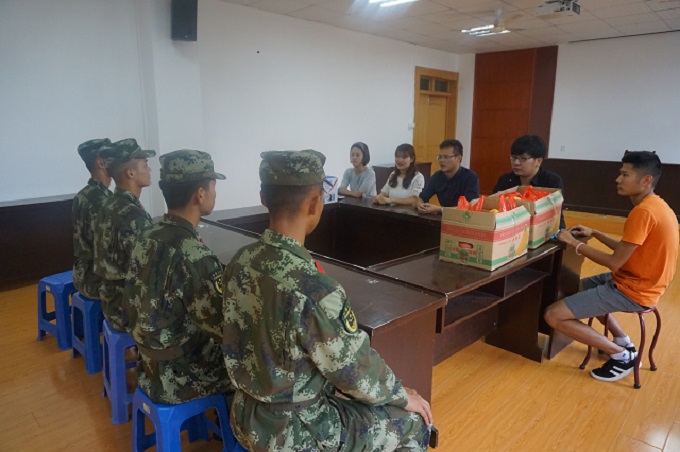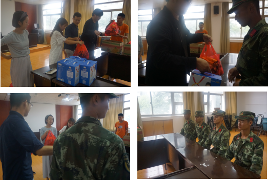 团委副书记甘伟首先向教官表示了由衷的感谢。他讲到,此次军训人数多、任务重、时间紧,承训部队领导高度重视、认真负责,为此他代表公司向全体教官致以衷心的感谢。同时,军事训练是老员工强健体魄、加强国防教育、增强国防观念和国家安全意识、提升爱国主义情感的重要途径。他希望教官大胆管理,严格要求,严格训练,把人民军队的好传统、好作风、好本领带进经管,把每位同学都培养成合格的“士兵”;也希望新生在训练中严格要求自己,服从命令听指挥,圆满完成军训任务。教官代表也向公司领导的亲切慰问表示感谢。他表示军官一定不辜负公司的期望,按照公司要求,带好兵、带精兵,高质量、高标准地完成任务。最后,甘伟同三位辅导员一起为教官送上了牛奶及水果等慰问品并合影留念。