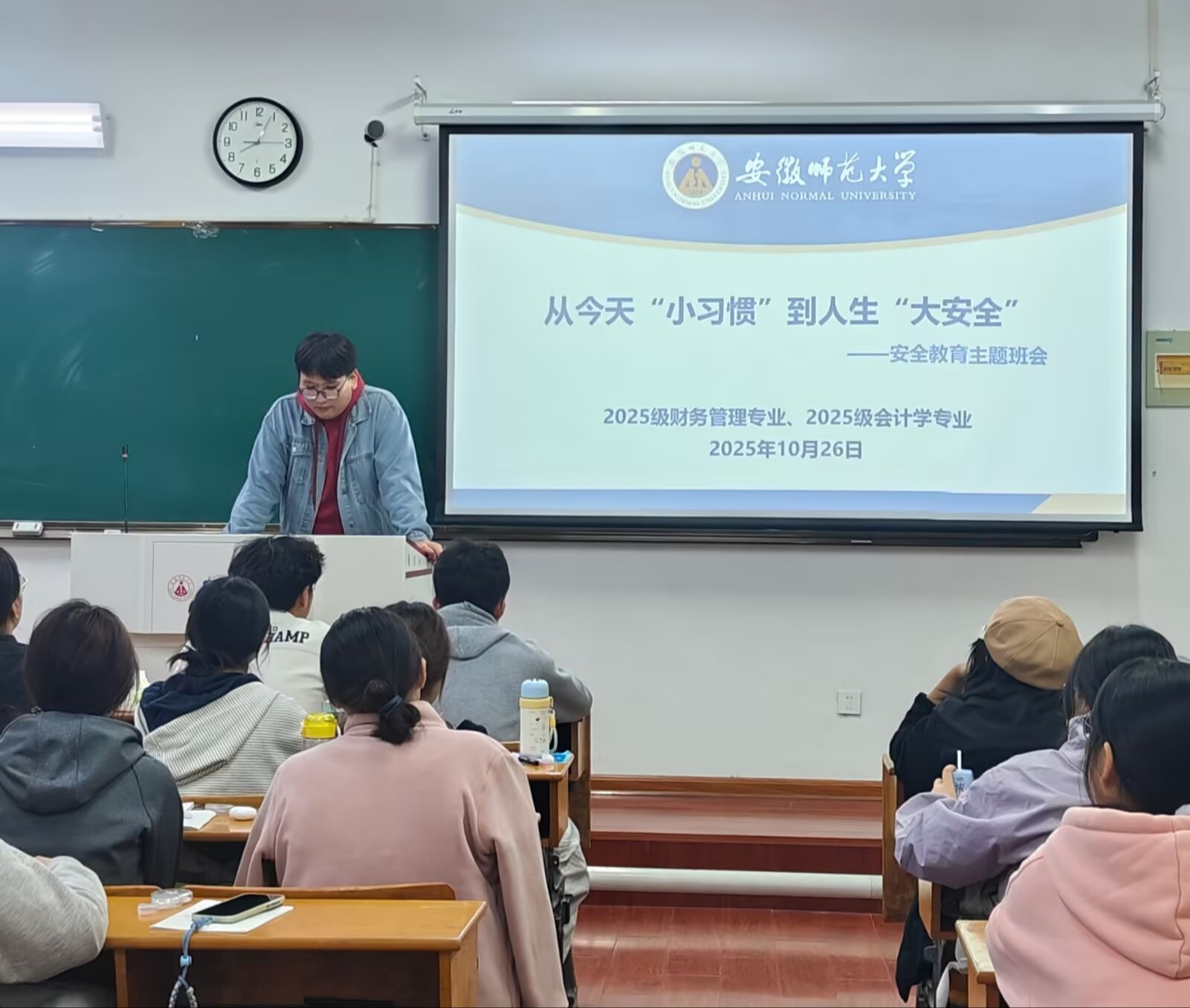 10月26日晚,2025级财务管理专业、2025级会计学专业班冬季安全教育主题班会分别在班级晚自习教室举行,由辅导员吕洋老师主讲。
