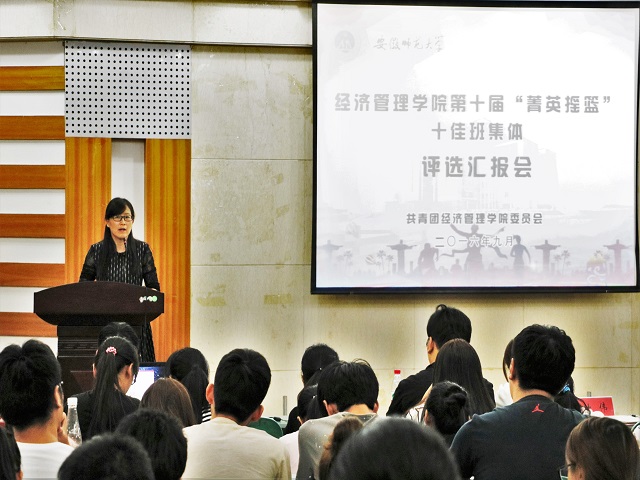 本届院十佳班集体评选共有13个班级参与汇报。参选班级以PPT演示和现场解说相结合的方式进行汇报,汇报成绩根据申请材料、PPT内容以及汇报表现三个部分来进行现场打分。各班分别从班级建设、思想文化、党团工作等多个方面进行汇报,总结班级在各方面做出的各项成绩。班级建设方面,充分反映了各班同学互帮互助、团结向上的精神风貌;学风建设方面,各班展示了在专业学习、学科竞赛、学奖金获奖等方面取得的丰硕成果;活动建设方面,独具公司和班级特色的素质拓展、志愿服务给现场观众留下了深刻的印象;各班级还围绕科技创新、专业实践、综合能力提升等方面进行了汇报展示,用智慧和汗水凝聚而成的获奖证书,共同参与的爱心活动,以及班级团结向上的美好瞬间,无不给在场的老师和同学留下了深刻的印象,也赢得了台下的阵阵掌声,展现出经管学子积极向上、团结友爱的精神面貌。最终,14财管、14物流、14会计等11个班级获得院第十届“菁英摇篮”十佳班集体荣誉称号。