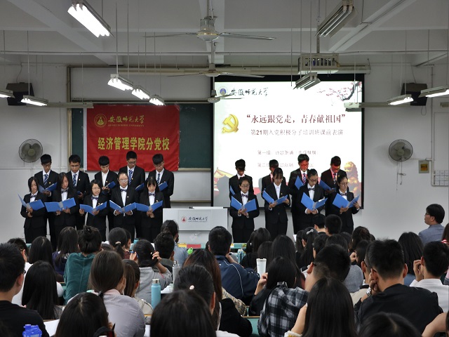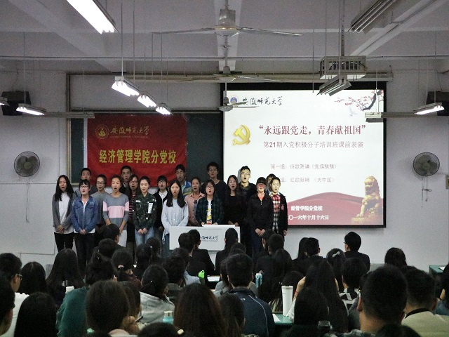 讲座正式开始前,党课班第一、二组分别以诗歌朗诵《党旗飘飘》和红歌献唱《大中国》的课前表演展现了永远跟党走,青春献祖国的红心。