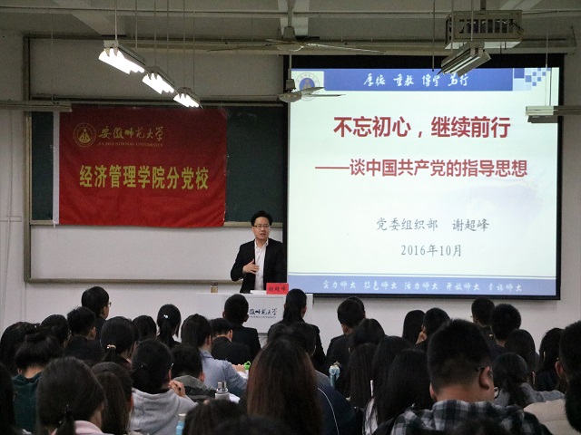 谢超峰从“是什么”、“为什么”、“怎么做”三个方面细致剖析了中国共产党指导思想的内涵、必要性和实现途径。“什么叫‘不忘初心,继续前行’,习近平总书记说道,我们党已经走过了95年的历程,要永远保持建党时中国共产党人的奋斗精神,永远保持对人民的赤子之心,就不能忘记走过的路,不能忘记走过的过去,不能忘记为什么出发。”谢超峰首先和大家强调指导思想学习的必要性,“因此在今天,我仍然要和大家谈一谈中国共产党的指导思想。”指导思想为什么这么重要,因为在今天新时期新形势下,中国共产党依旧面临着很多挑战和考验。生于忧患,死于安乐。国内环境上,长期执政给党带领哪些考验呢?无论是干部队伍、基层党组织建设,还是宣传思想工作、党风廉政建设,谢超峰紧密结合国家当前时政热点、反腐工作向我们说明新时期下的考验;国际环境上,从太平洋两岸的美日朝韩到亚欧大陆的俄罗斯、印度,从“四海”岛礁威胁到疆独、藏独、东突事件,无不体现着我国、我党新形势里的挑战。为什么要反复学指导思想,就因为我们党时刻居安思危,与时俱进、充满生命力,决不会走苏联的老路。