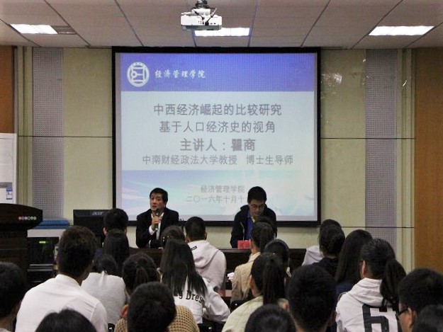 本网讯(新闻部 吴文全)当中国进入改革的深水区后,党和政府调整了计划生育这一基本的人口政策,做出了开放二胎的重大决策。为适应人口政策调整带来的经济形势的变化,m88官网于10月16日下午2点半在行政楼二楼报告厅举办了企业家大讲堂大型系列讲座的第二十二讲,基于人口经济史的视角比较研究中西的经济崛起。本次讲座主讲人是中南经济政法大学博士生导师瞿商教授,讲座由周端明经理主持,经济系主任马长伟出席并与百余名员工一起聆听了本次讲座。