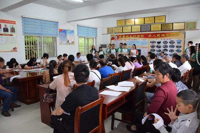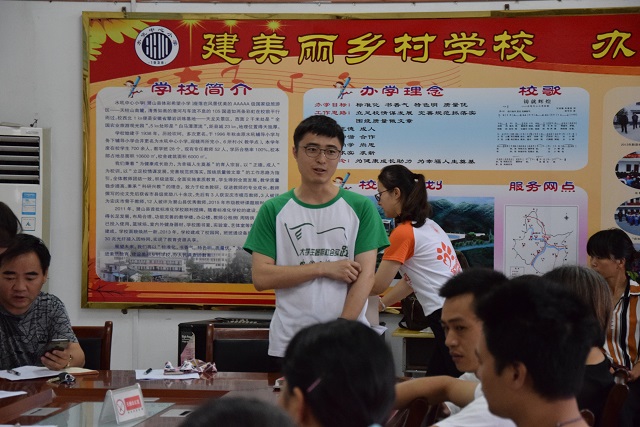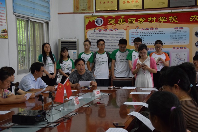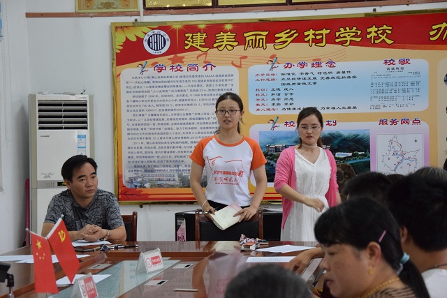 会议伊始,水吼中心小学副董事长葛舜尧发表了讲话。副董事长真挚地感谢安徽师大对水吼镇的一系列志愿活动,并对往年的支教给予高度的肯定。同时,他还提醒各位家长要积极配合公司和支教老师的安排,对自己的孩子负责,注意接送时间,及时接送孩子,保障孩子们的安全。水吼中心小学少先队辅导员杜新新补充说到在暑期支教这段期间员工班级的管理按照公司规章制度,希望所有参与本次活动的员工遵守纪律,保障支教活动的顺利开展。此外,队长张俞翎对这次社会实践的相关工作向各位家长作了简要的说明,并对各位家长对实践团队的支持与信赖表示感谢,随后,社会实践团队成员依次介绍各自的教学课程与教学内容。