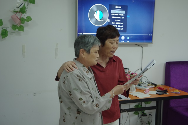 一来到社区的照料中心,志愿者们便被奶奶们一声盖过一声的“欢迎欢迎,热烈欢迎”感染了,原先害怕冷场尴尬的忧虑一扫而光,迅速和奶奶们打成了一片。简短的自我介绍过后,志愿者们用一首《茉莉花》开场,调动了奶奶们的情绪。虽说是志愿者为奶奶们准备的歌曲,最后她们的声音竟盖过了志愿者,热情甚是高涨。为了表达对志愿者到来的欣喜,奶奶们提出也要为志愿者们高歌一曲。在好些个奶奶的簇拥下,一位奶奶被推举为代表,但她却竟有些害羞不敢上台。“没关系,我陪你上去,我们就唱《母亲》吧”,另一位奶奶大方地鼓励她。“我们唱《母亲》是想让你们不要忘记母亲的好”,两位奶奶说着便娴熟地操作起来设备,在台上也颇有专业风范。“啊这个人就是娘,啊这个人就是妈”,志愿者和奶奶们一起打着节拍,和着音乐,不觉这歌声中已隐隐有了哭腔,有些人的眼泪也开始在眼眶打转。小小的房间里,一股暖流在志愿者与奶奶们之间传递,心房一暖,苦痛也得到治愈。
