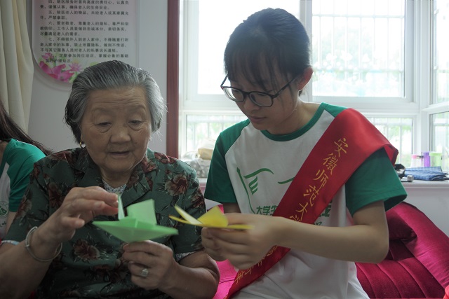 照料中心的老人们大部分年事已高,但依然有着无尽的活力和精神。“奶奶们你们多少岁啦,精神怎么这么好”,一位志愿者发问。“我啊,八十了”,“我都过了八十岁喽,八十二喽”。合影留念时,“今天开不开心?开心!”,“今天快不快乐?快乐!”年龄藏不住岁月的痕迹,也藏不住“老”样子下的“新”姿态。静静伫立,她们的笑声远去,脚步轻盈。