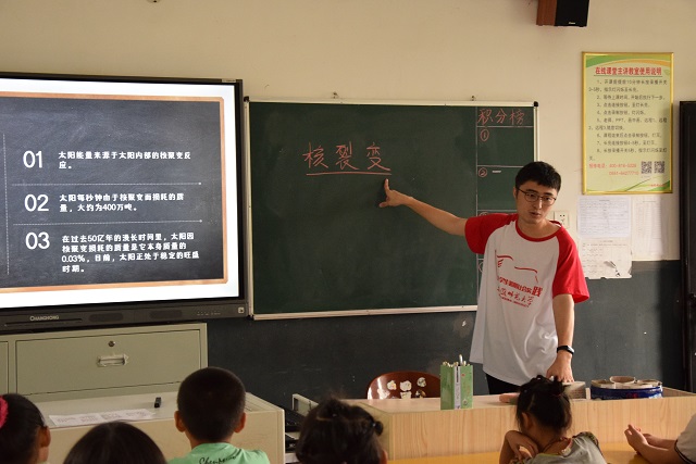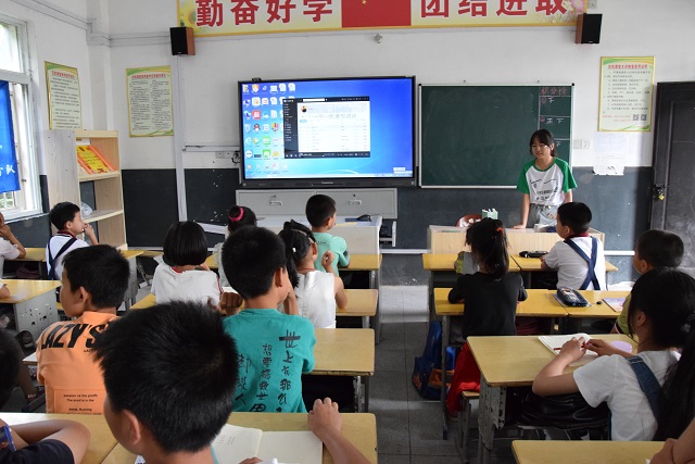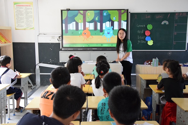 恰风华正茂,育若水少年。“小朋友们,你们知道哪些颜色吗?”小青柠老师问道。“老师,我喜欢红色……”孩子弱弱地说出青涩的英语。据了解,由于当地教学条件的限制,英语教学相对薄弱,孩子们的英语口语能力较低。但在上课的过程中,小朋友们表现极大的兴趣与好奇心,争抢着回答问题,积极参与课堂游戏,课堂气氛十分活跃。佳期如梦,满空星斗。地理课上小朋友们遨游在美丽的宇宙中,探索星空的奥秘。“可嗅到仲夏柠叶香,你莞尔的笑,身旁青色的柠檬微荡”孩子们甜美的歌声回荡在整个校园,如向日葵般灿烂而热烈,如山涧溪流般清澈而纯粹。小青柠老师通过小组合作与探究,使孩子们在律动及音乐游戏中感受了音乐带来的欢乐。