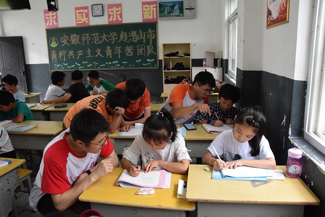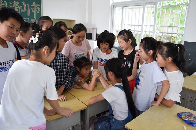 做一些小事,温暖孩子,温暖自己。在课间活动时间,游戏也必不可少,课间扳手腕大赛如火如荼地举行,社会实践队员与小朋友们拼尽全力,角逐激烈。此外,他们还同小朋友们一起玩飞行棋,展开智慧的较量。通过各种游戏活动,增进了队员们与小朋友们之间的了解,拉进了彼此之间的距离。在作业辅导中,队员们认真仔细地讲解了小朋友们所提出的问题,还对知识点进行相关拓展,进一步丰富了孩子们的知识储备。天很热,心很暖,因为你们在心田。让心更近,让爱飞扬!