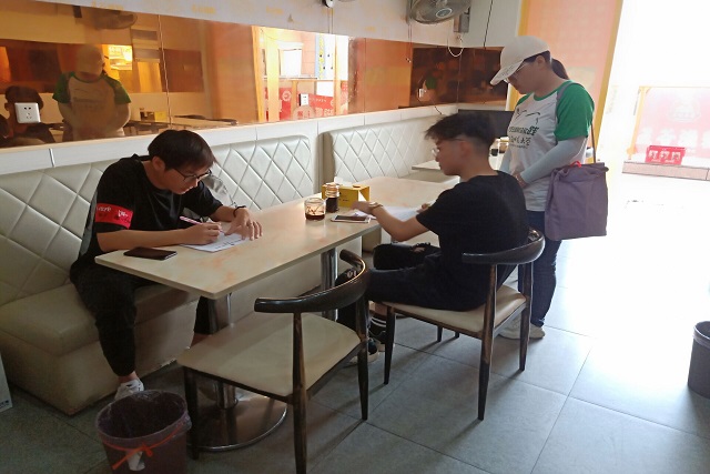 弋江队首先来到德胜广场。早上的德胜广场人很少,很多店铺还没有开张,队员们便一家店一家店地寻找受访者。