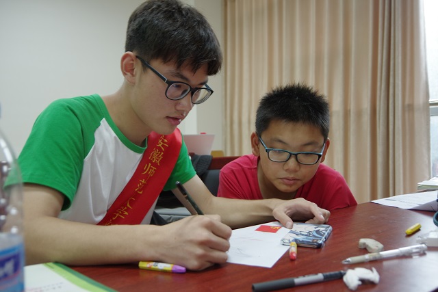 “这题应该这样做!”“我觉得应该用这个方法······”几个小朋友和几位志愿者聚在一起,讨论着一道数学题,他们各抒己见,讨论得热火朝天。这是志愿者们在牌楼社区支教时,课间时间里最常见一幕。